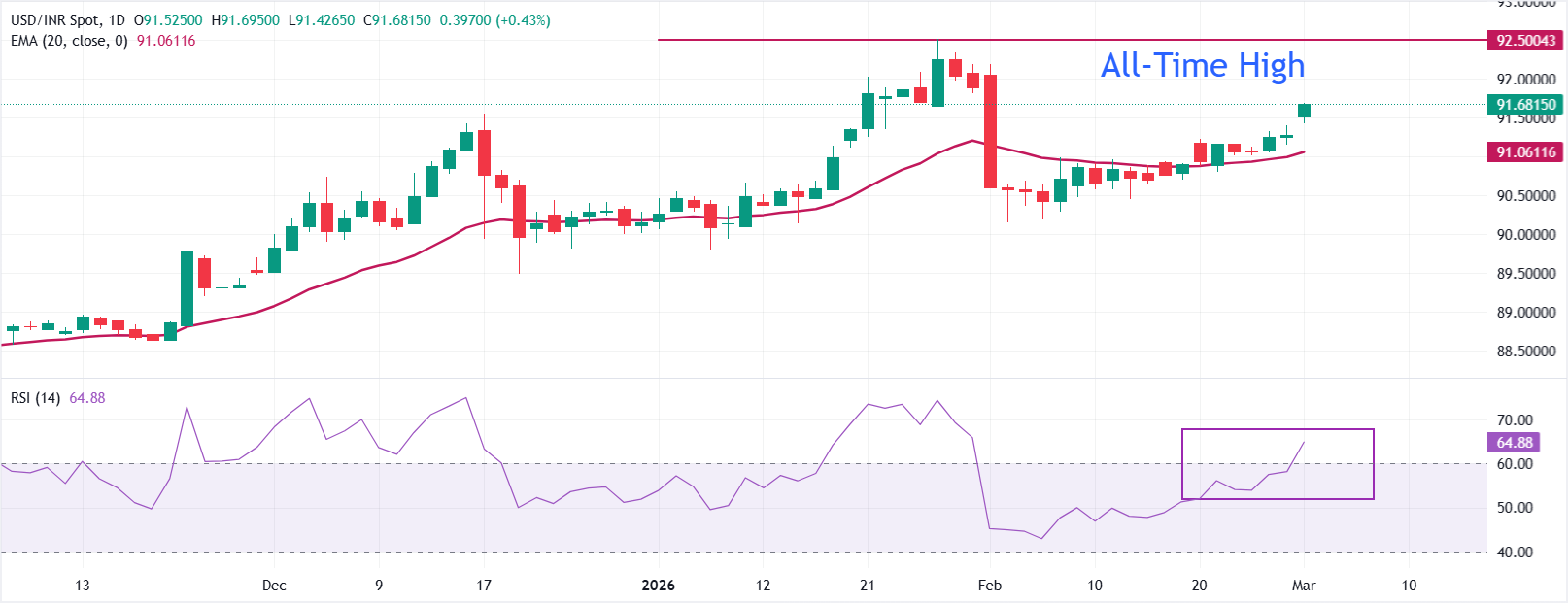 USD/INR jumps to near 91.75 in the opening trade on Monday, the highest level seen in a month. The pair demonstrates a mild bullish bias as price holds above the 20-day Exponential Moving Average, which is starting to edge higher again after a period of consolidation.