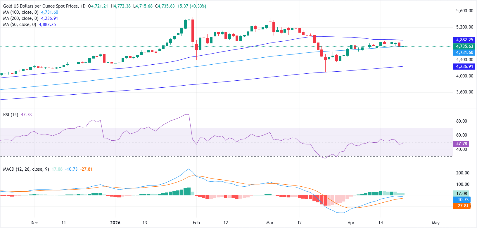 The precious metal holds a constructive near-term bias as it sits above the 200-period Exponential Moving Average (EMA) at $4,784.25. The 50.0% retracement level of the March downfall, at $4,762.13, adds a secondary layer of underlying demand beneath the EMA. Meanwhile, momentum gauges remain subdued rather than directional, with the Relative Strength Index (RSI) hovering near a neutral 51, and the Moving Average Convergence Divergence (MACD) indicator is marginally negative. This hints that bulls retain structural control but lack strong follow-through for now.