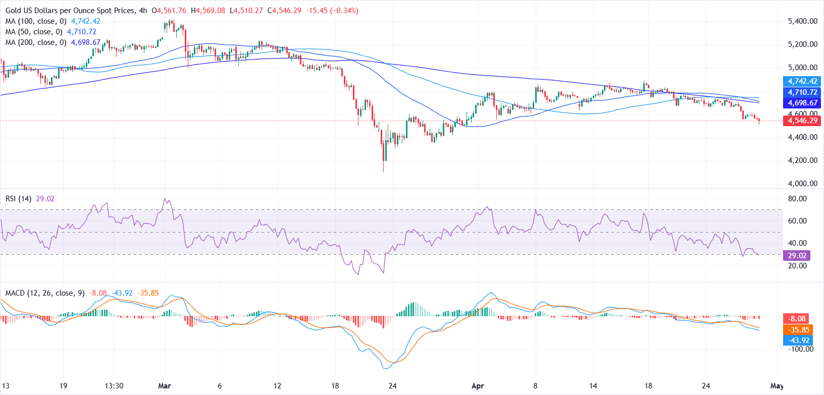 Gold (XAU/USD) slips to a near one-month low, pressured by a firmer US Dollar (USD) and mounting Oil-driven inflation concerns, as investors await clearer signals on stalled diplomatic efforts between the United States (US) and Iran to end the war. At the time of writing, XAU/USD is trading around $4,571, down roughly 2.37% on the day.