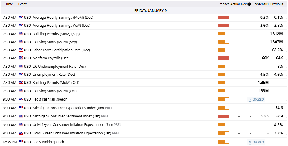- The University of Michigan Consumer Sentiment preliminary reading for January rose to 54, up from November’s final 52.9, and beating forecasts of 53.5. American’s inflation expectations for one-year were unchanged at 4.2%, while five-year expectations edged up to 3.4% from 3.2%.