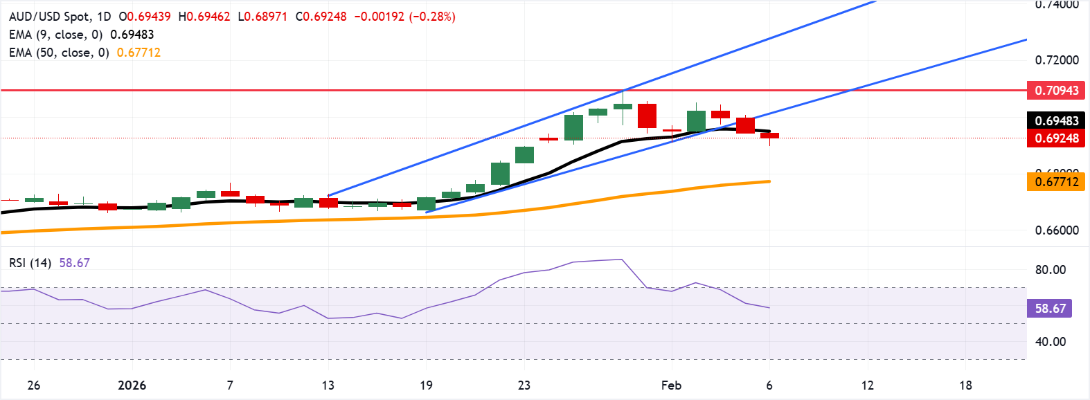 The AUD/USD pair may test the immediate barrier at the nine-day Exponential Moving Average (EMA) of 0.6946. A rebound within the ascending channel would strengthen the bullish bias and target 0.7094, the highest level since February 2023, which was recorded on January 29. A break above this level would support the pair to test the upper ascending channel boundary around 0.7270. On the downside, the primary support lies at the 50-day EMA at 0.6771.