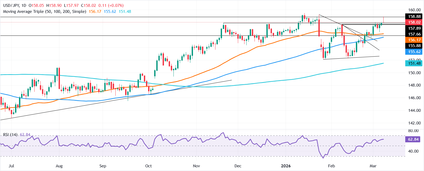 USD/JPY trades around 158.10 on Monday at the time of writing, up 0.10% on the day, as markets react to heightened geopolitical tensions in the Middle East and sharp moves in the energy market.