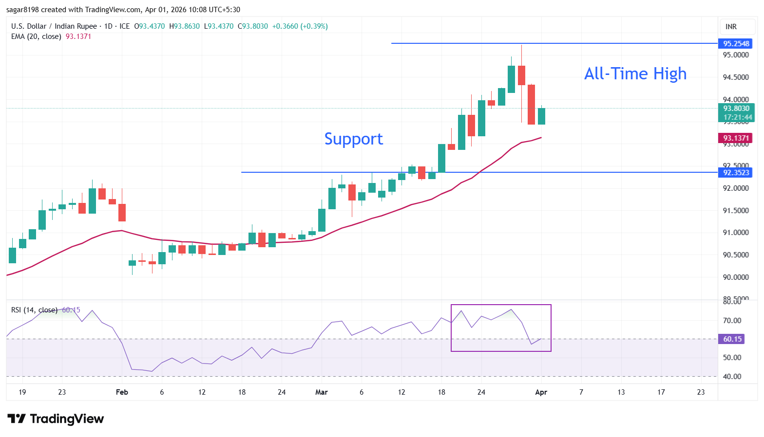 Technical Analysis: USD/INR retraces from all-time highs of 95.22
