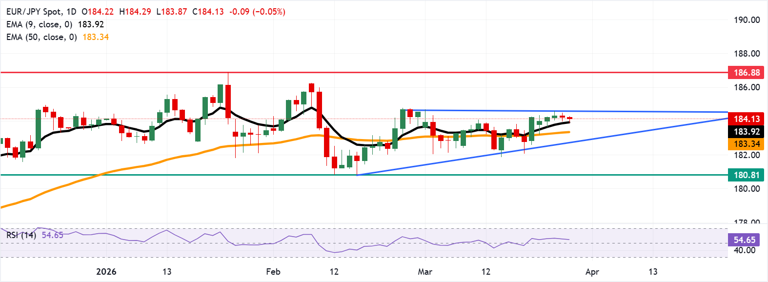 EUR/JPY extends its losses for the second successive session, trading around 184.10 during the Asian hours on Friday. The technical analysis of the daily chart suggests the currency cross remains close to the upper boundary of the ascending triangle pattern, reflecting rising buying pressure and leading to an upside breakout.
