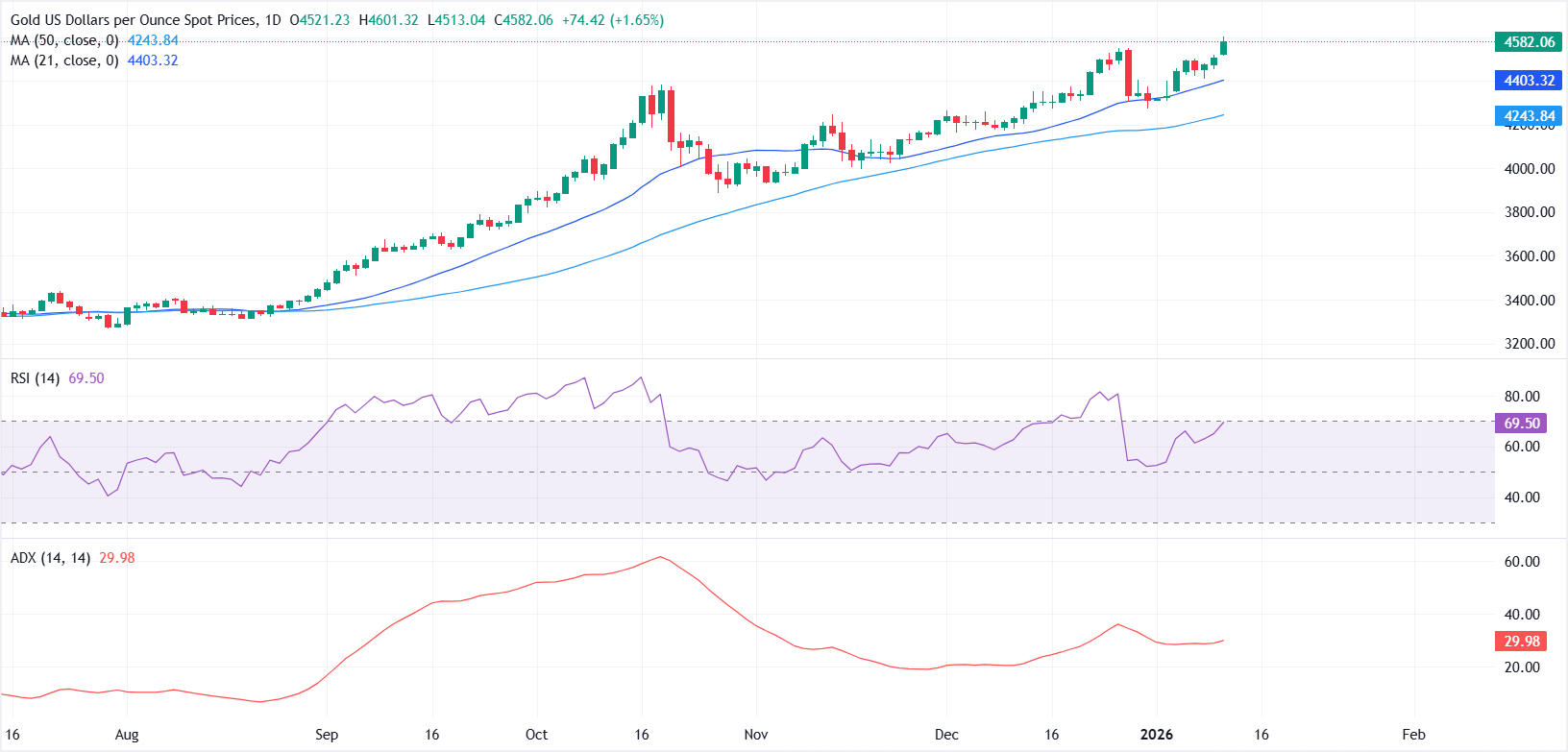 On the downside, initial support is seen around the $4,500 psychological level. On the upside, bulls are eyeing a sustained break above $4,600, which could open the door toward the $4,700 region. The Average Directional Index (ADX) near 30 signals that the broader trend remains strong.
