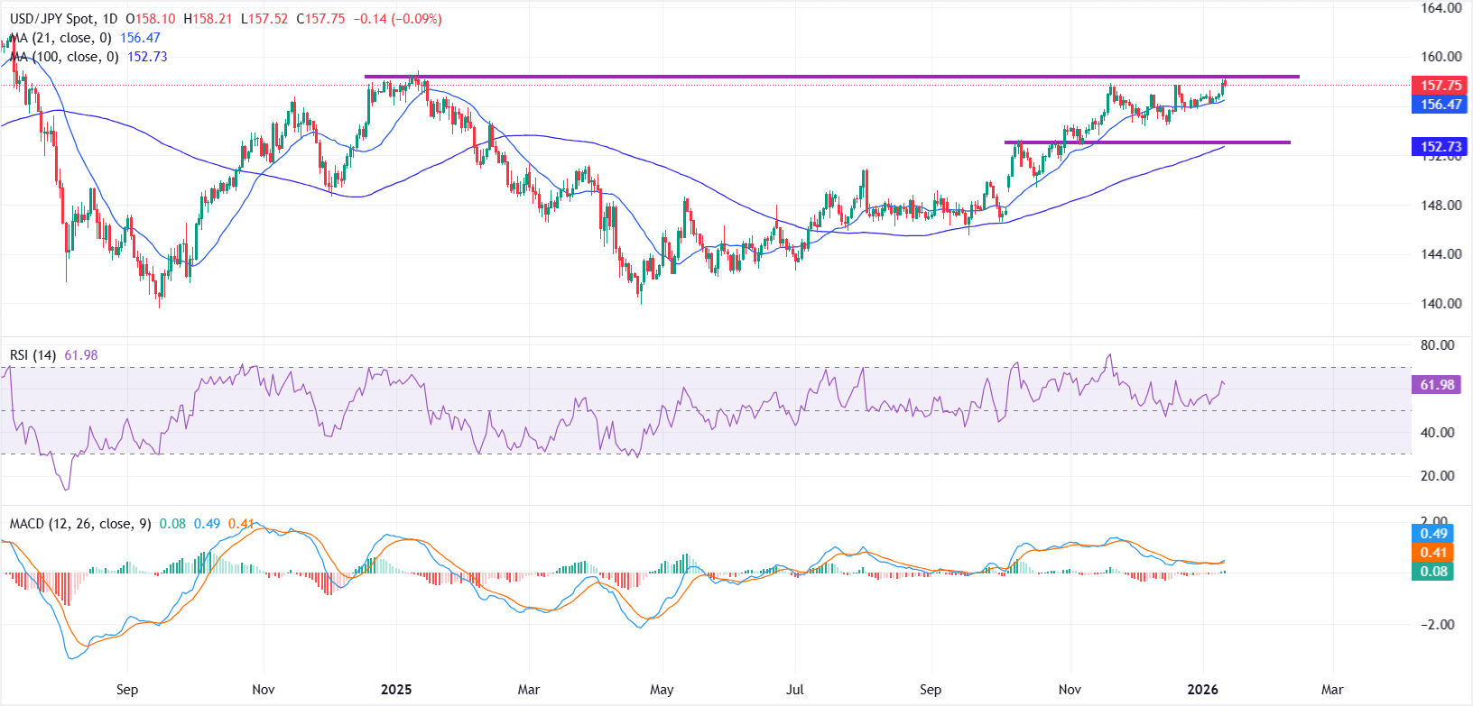 On the upside, the 157.80-158.20 region continues to cap gains, as reflected in the rejections seen in November and December. A sustained break above this zone would strengthen bullish momentum and open the door toward the 160.00 psychological mark, last seen in July 2024.