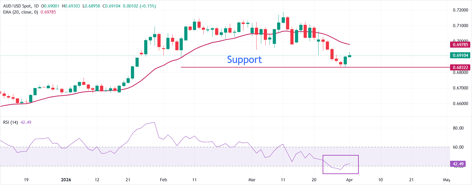 AUD/USD trades higher at around 0.6910 at the press time. However, the near-term bias is mildly bearish as the pair now holds below the 20-day Exponential Moving Average (EMA), which has started to roll over after capping recent rebounds near the 0.70 area. Price has transitioned from trading above this average to respecting it as dynamic resistance, underscoring a loss of upside momentum from the mid-0.71 region.