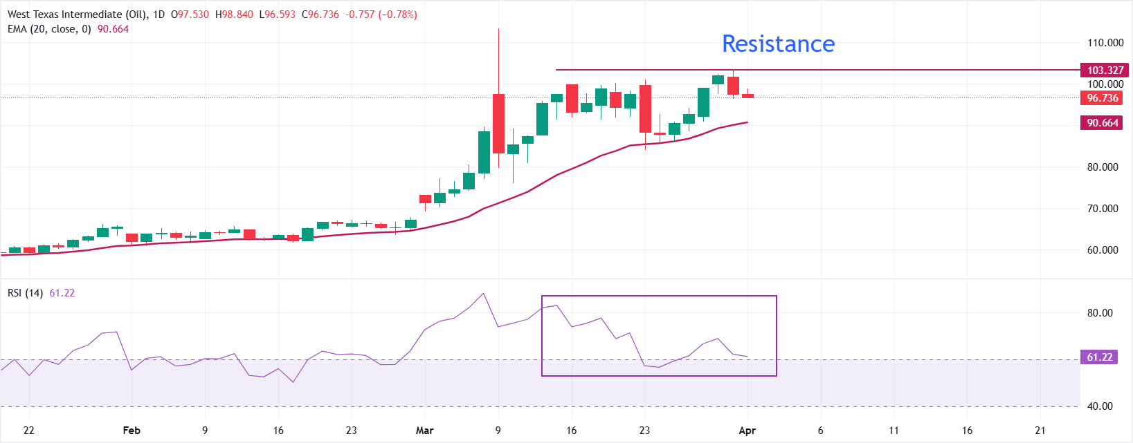 West Texas Intermediate (WTI), futures on NYMEX, is down 0.8% to near $96.60 in the early European trade on Wednesday. The oil price extends its correction from the three-week high of 103.33 posted on Tuesday on hopes of a ceasefire in the Middle East war.
