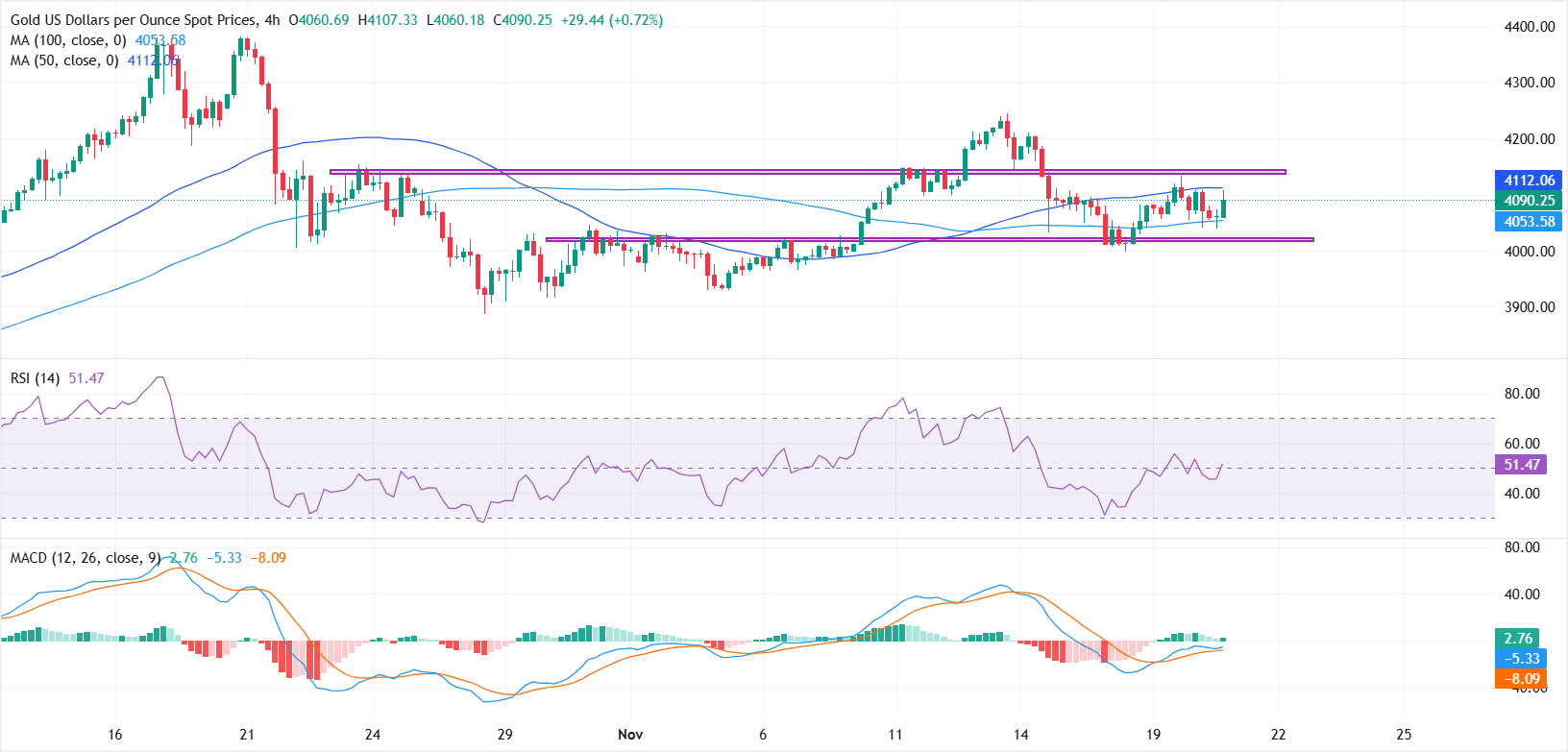 Failure at $4,100 would expose $4,050 before diving to the November 18 swing low of $3,998, ahead of testing the 50-day Simple Moving Average (SMA) at $3,981.