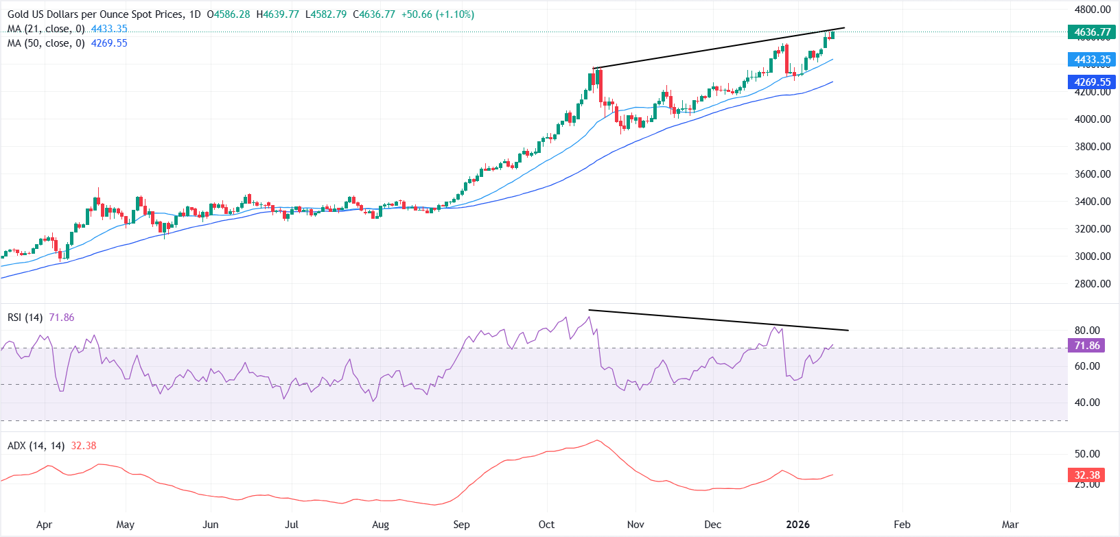 XAU/USD trades at record highs at $4,634 at the time of writing. The bullish bias remains in play with moving averages trending higher. Technical indicators, however, are starting to give signs of an overstretched rally.