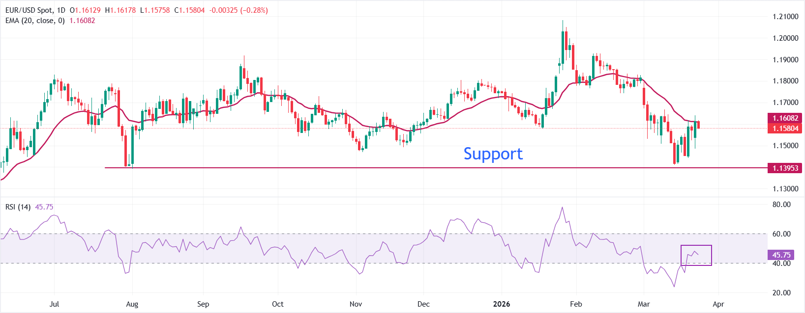 EUR/USD trades 0.22% lower to near 1.1580 in the early European session. The pair stays pressured below the 20-day Exponential Moving Average (EMA) near 1.16, which keeps the near-term bias mildly bearish despite the recent stabilization off the lows. Price action has carved out a sequence of lower daily closes over recent weeks, and the failed attempts to reclaim the 20-day EMA reinforce a downside-oriented structure.