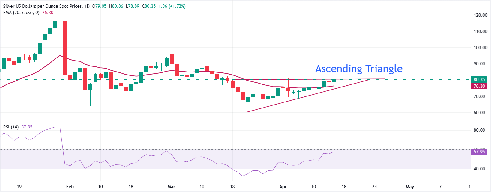 Looking up, the Silver price could approach the March 13 high of $85.46 if it manages a decisive breakout of the horizontal boundary of the Ascending Triangle formation at around $80.80