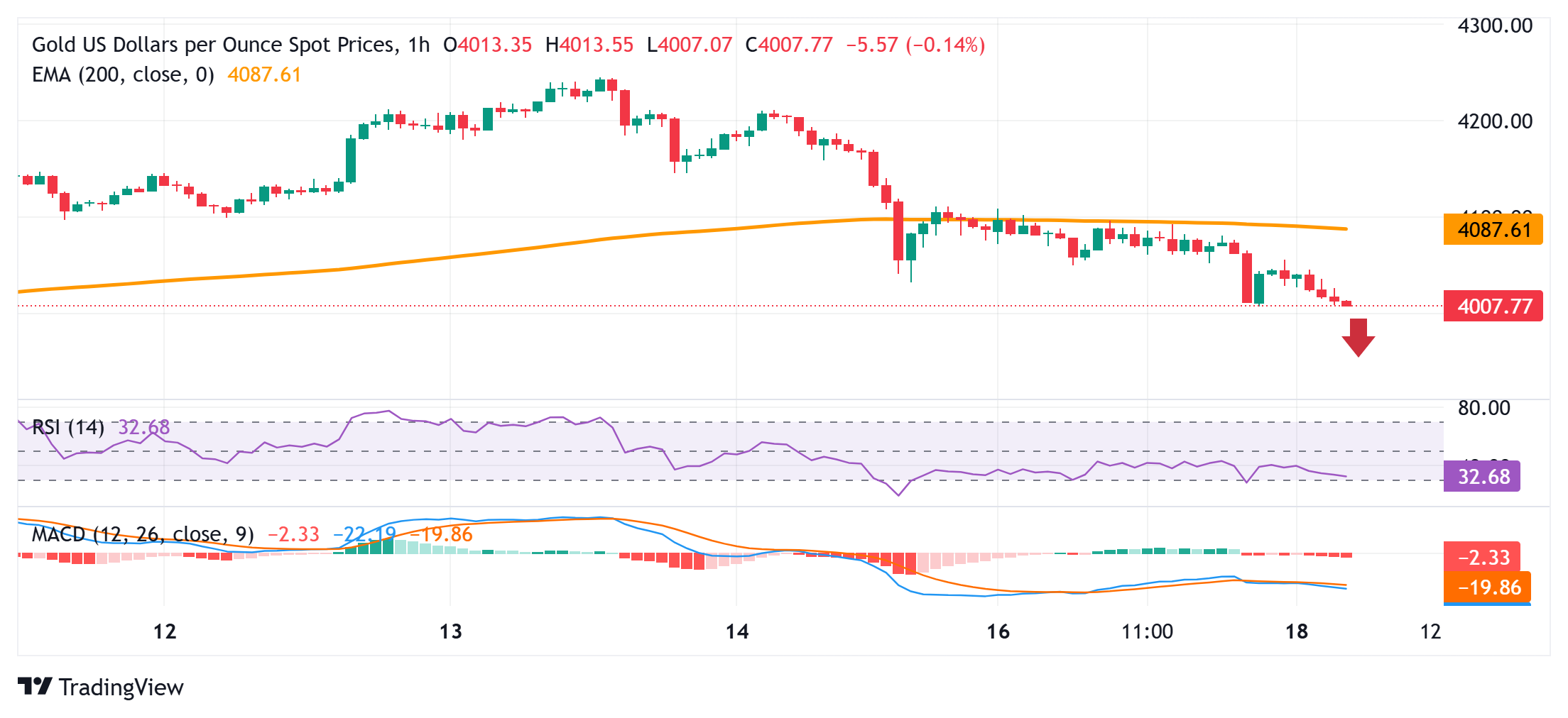 Gold’s momentum remains subdued, though dip-buying continues to emerge after bulls successfully defended the $4,000 psychological support. On the upside, XAU/USD faces a confluence resistance zone near $4,050, reinforced by the 100-period Simple Moving Average (SMA) on the 4-hour chart.