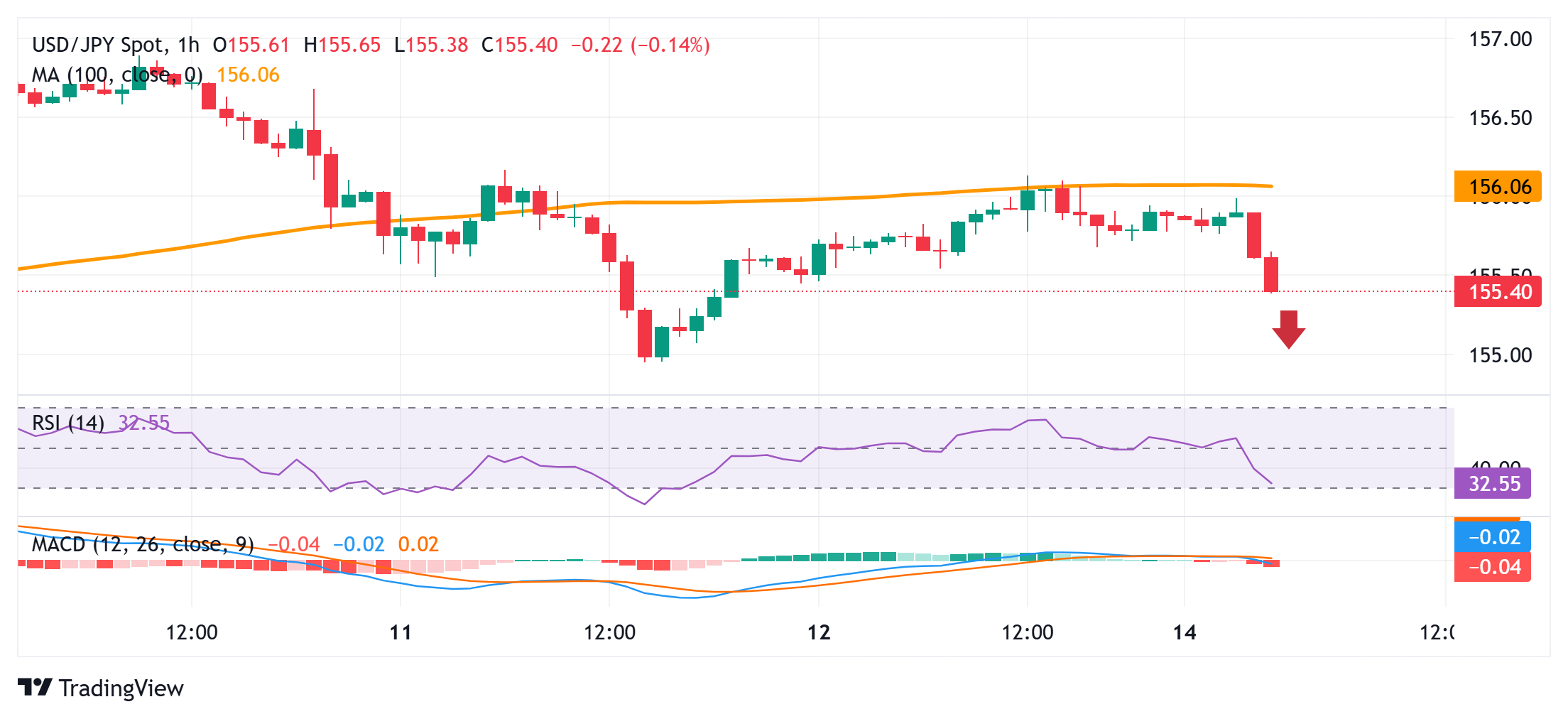 USD/JPY seems vulnerable while below the 100-hour SMA hurdle near the 156.00 mark