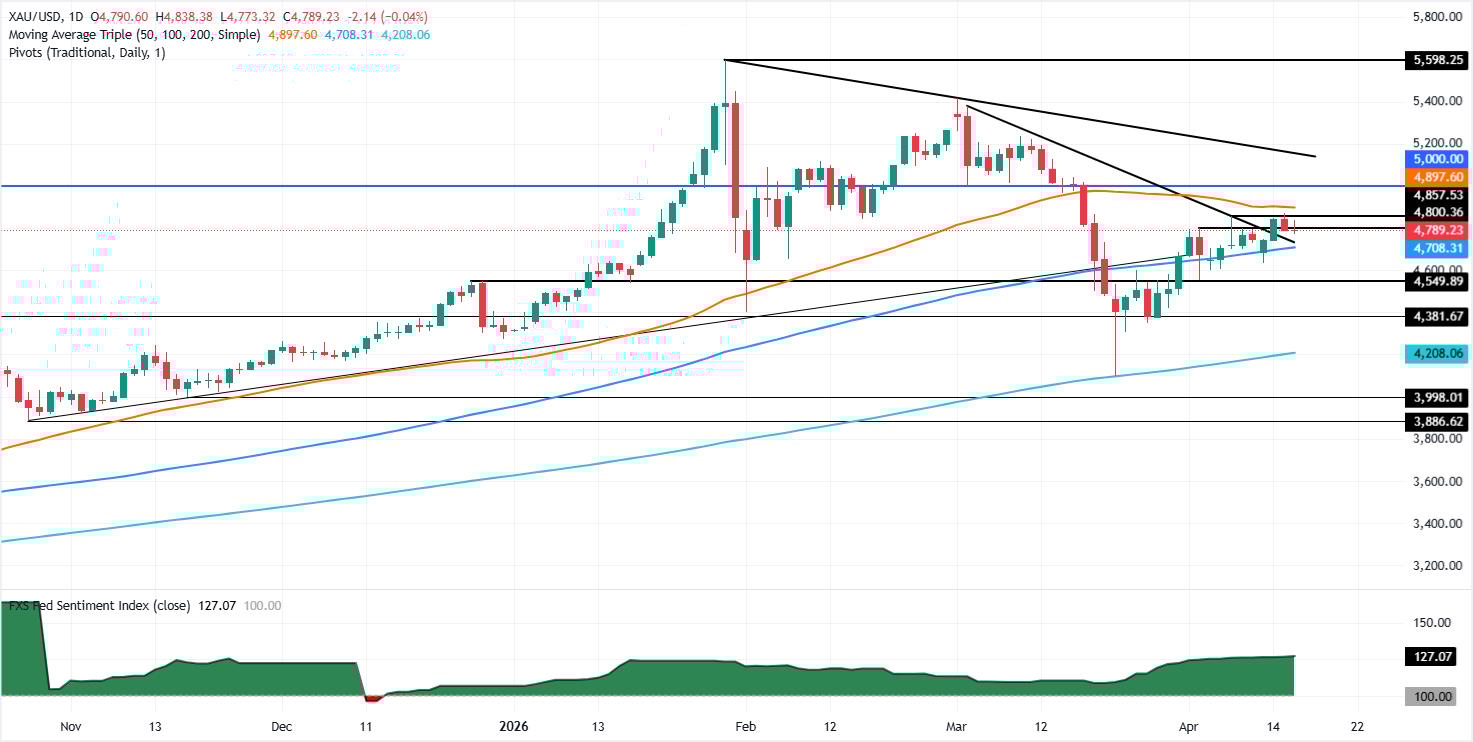 The XAU/USD pair remains just under the 200-period Simple Moving Average (SMA) at $4,831.22, which acts as immediate overhead resistance and keeps the rebound in check. Meanwhile, the Moving Average Convergence Divergence (MACD) has turned positive, and the Relative Strength Index (RSI) hovers near 60. This hints at firm but not overheated bullish momentum that has yet to overpower the prevailing structural cap.