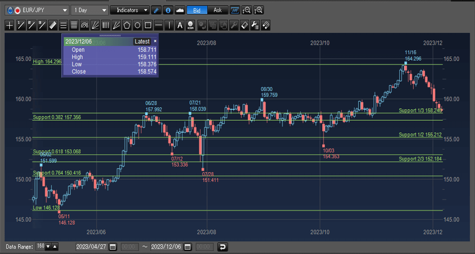 For example, in the EUR/JPY daily chart below, there was an uptrend from 146.128 to 164.296. The price then started to go down.