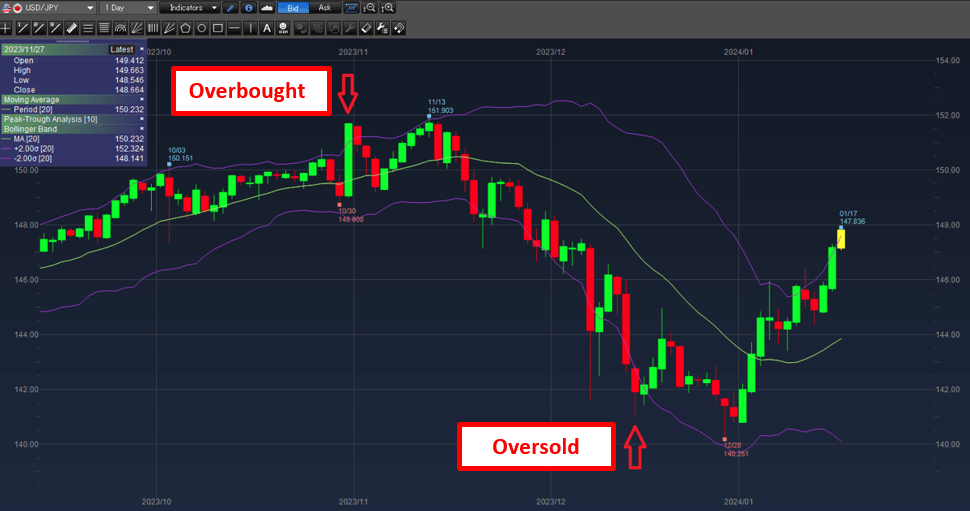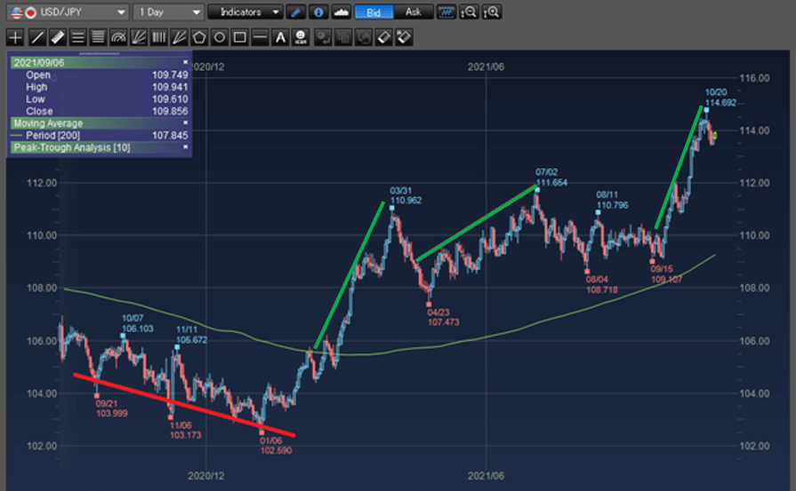 As shown in the USD/JPY Price Chart below, price is below the 200-day moving average at the beginning and creates an downward trend.