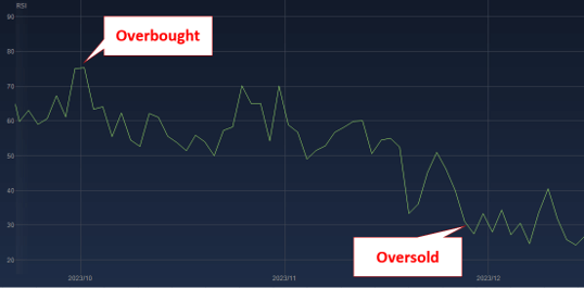 In below chart, RSI was above 70 on October 2023, which typically indicate overbought conditions. Some traders expect the rising trend is likely to reverse, which means it’s an opportunity to sell.