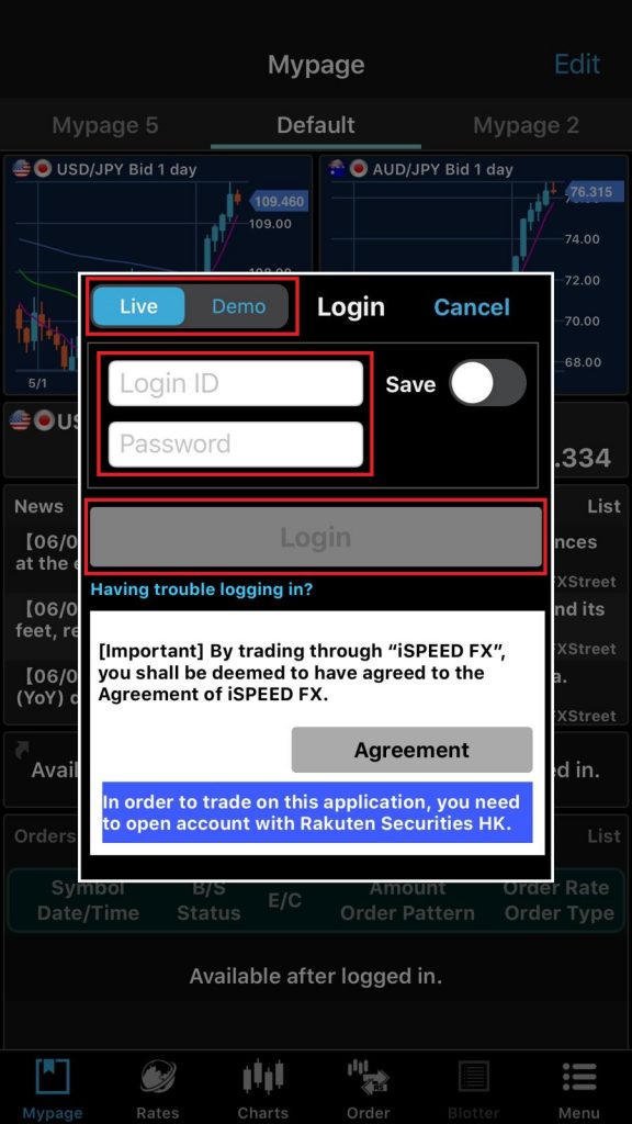 *If you don’t have any Rakuten FX’s live accounts, please contact with us. - Launch iSPEED FX on your mobile device and it will show login screen form.