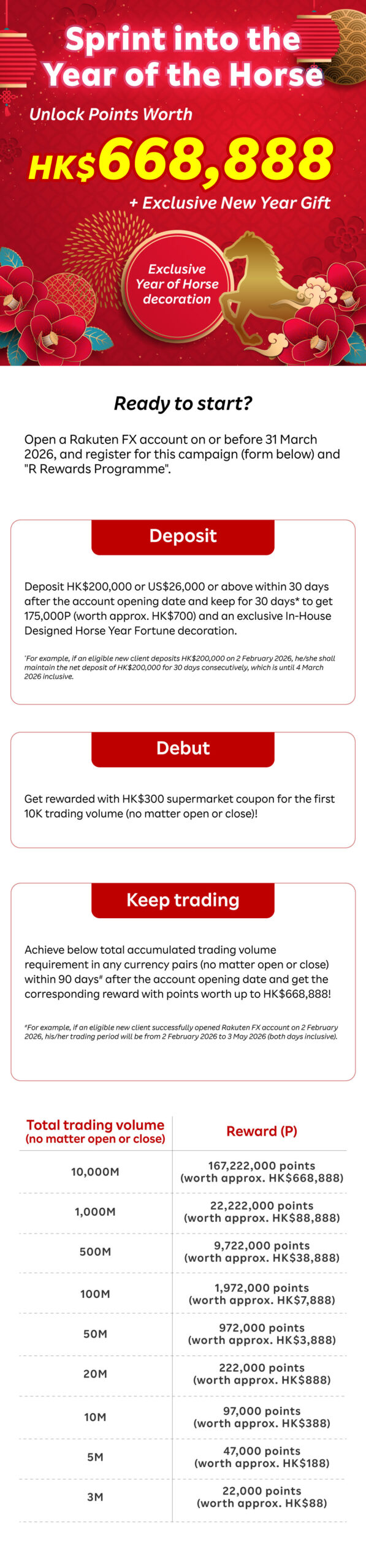 6. New Client who successfully open an account during the Account Opening Period and, within 30 days after the account opening date, deposits a minimum of HK$ 200,000 or US$ 26,000 to the Eligible Account and maintain a net deposit of at least the above amount (net deposit = total deposit – total withdrawal, excluding the changes in account equity due to trading) for 30 consecutive calendar days upon the date of deposit can receive 175,000 points (worth approx. HK$700) and an exclusive In-House Designed Horse Year Fortune decoration (“Deposit Reward”).
