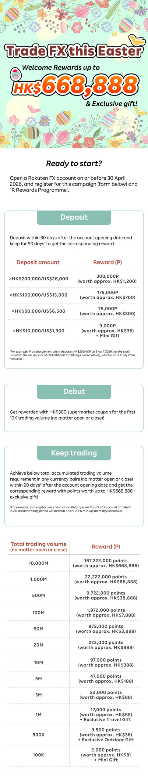 - This Campaign applies to new clients who successfully open a Rakuten FX account from 1 April 2026 to 30 April 2026 (both dates inclusive) (“Account Opening Period”), and do not currently hold and closed any trading account with Rakuten Securities HK within the past twelve (12) months before the commencement date of this Campaign (“New Client”).