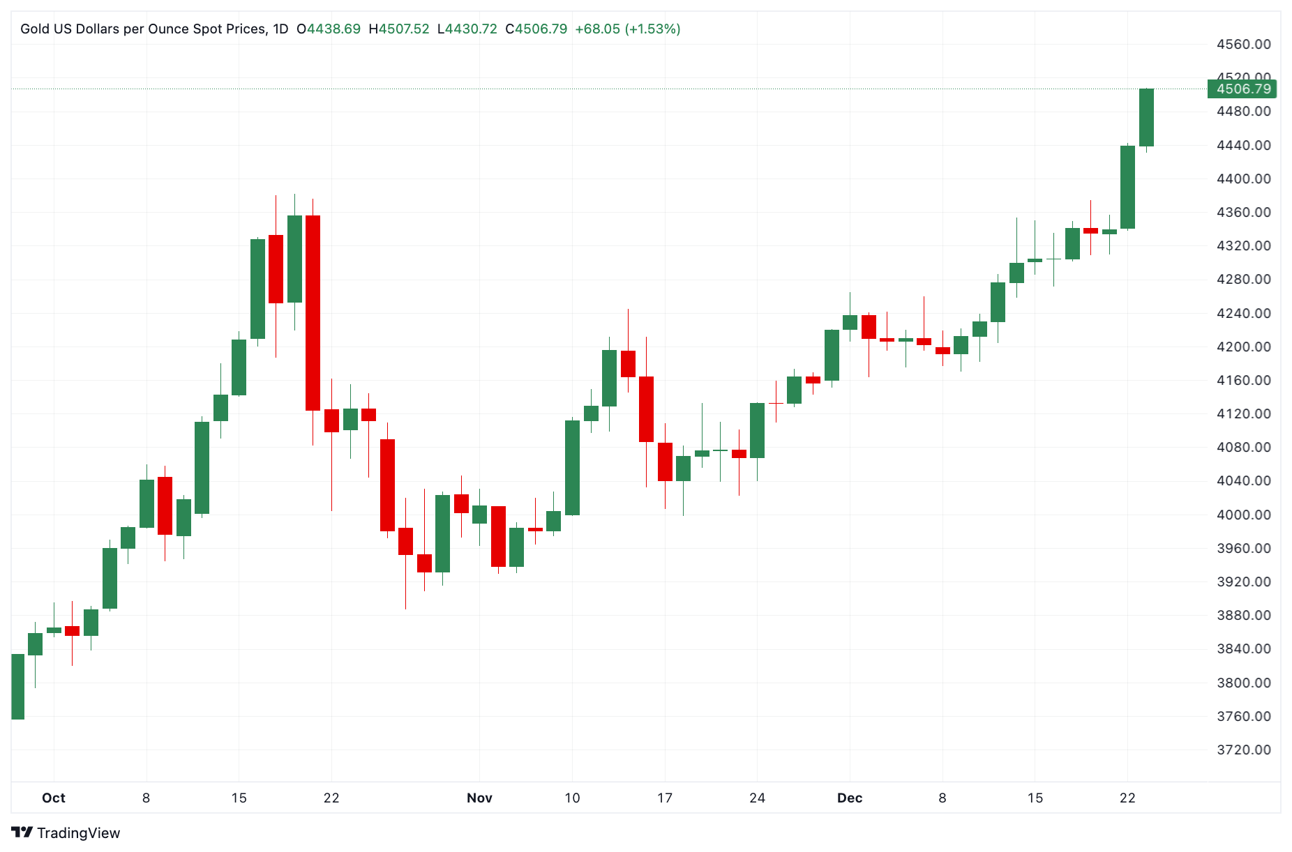 黃金(黃金/美元)在週三亞洲時段上漲,觸及4505美元的歷史高點。由於以色列-伊朗衝突和美國-委內瑞拉緊張局勢的加劇,貴金屬的避險需求得到提振。