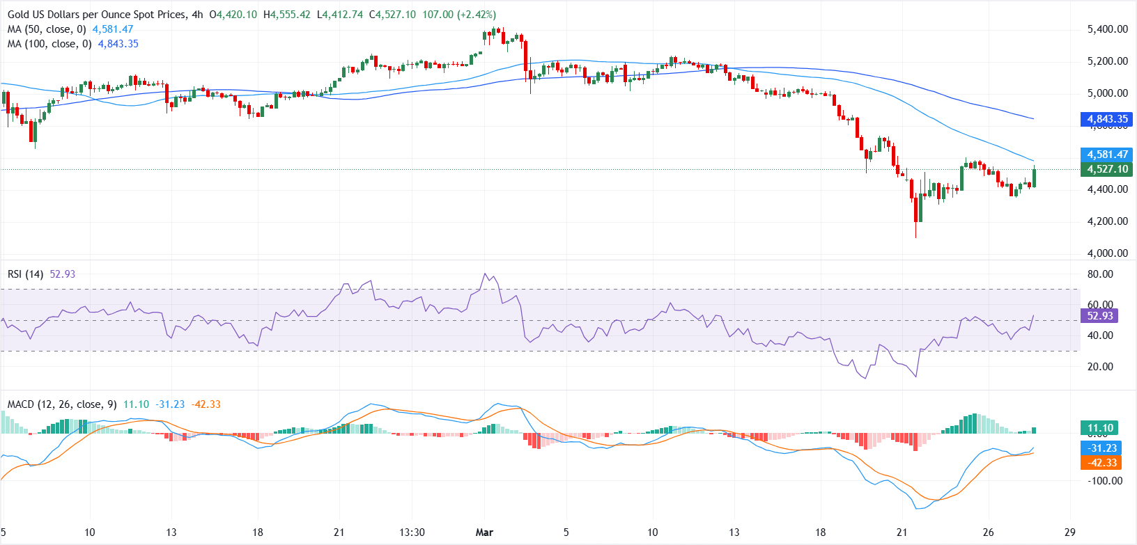 黃金(黃金/美元)週五小幅上漲,此前因美國-以色列與伊朗戰爭相關的地緣政治新聞不斷變化,推動全球市場波動,導致前一日下跌近2.75%。撰寫時,黃金/美元交投於約4527美元,日內上漲超過3.00%。