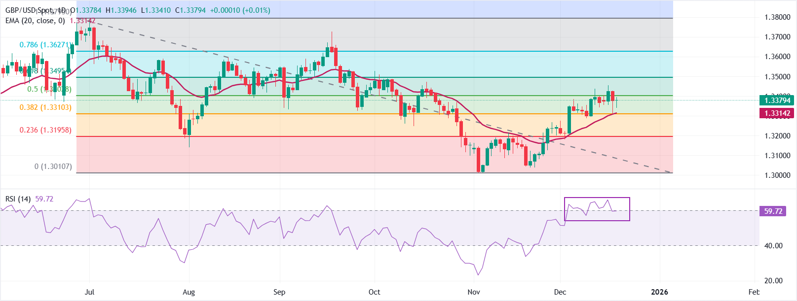 GBP/USD在週四晚間歐洲交易時段升至接近1.3400。20日指數移動均線(EMA)上升,價格保持在其上方,均線在1.3314,支撐著上漲。