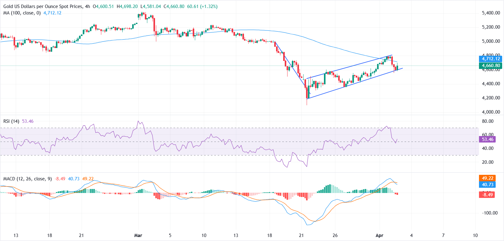 從技術角度來看,黃金/美元短期內仍傾向於下行。在4小時圖上,價格未能維持在約4711美元的100簡單移動平均線(SMA)上方,保持了看跌偏向。