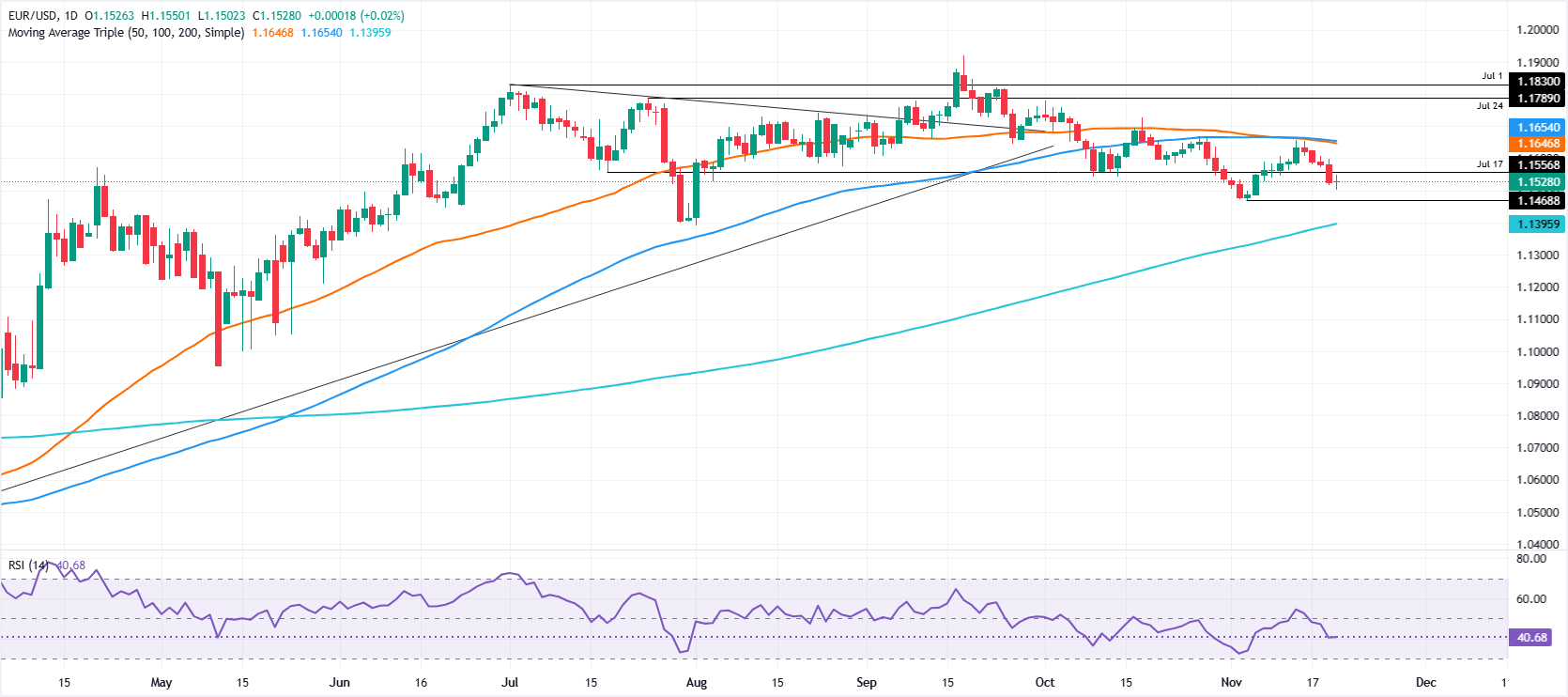 關鍵支撐位在1.1500,隨後是11月5日的低點1.1468。果斷突破將暴露200日SMA在1.1395的支撐位。