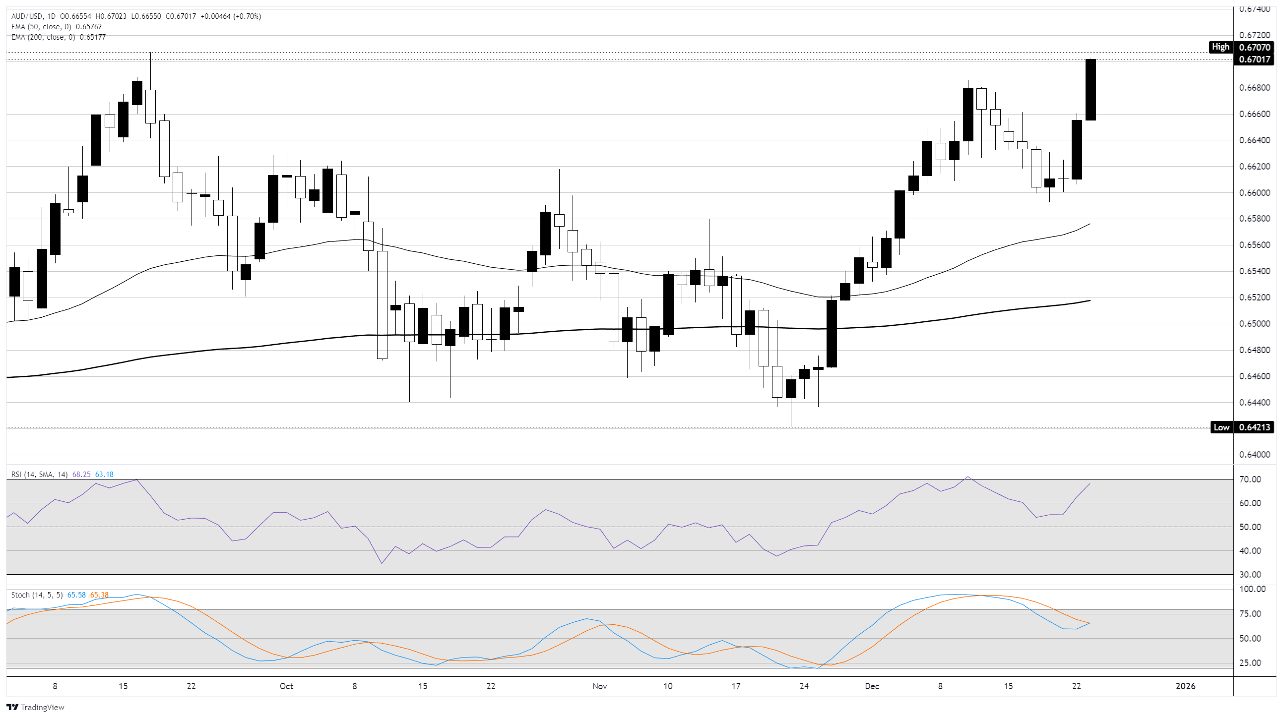 - 澳元/美元週二上漲0.66%,市場情緒在假期前傾向於看漲。