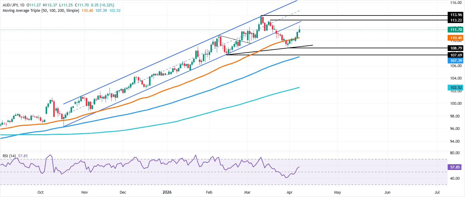 澳元兌日圓延續漲勢,受中東衝突在美伊之間暫停兩週帶動的風險偏好改善推動。不過,交易者需注意,以色列襲擊貝魯特,稱黎巴嫩不屬於停火協議範圍,敵對行動仍在繼續。撰稿時,澳元/日圓報111.79,上漲0.39%。