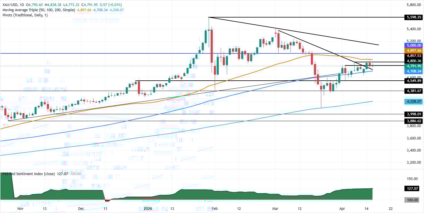 從技術角度來看,日線圖顯示該金屬價格仍承壓於50簡單移動平均線(SMA)下方,當前位於約4,897美元附近,構成直接的上方阻力。同時,100簡單移動平均線(SMA)位於約4,708美元附近,提供直接支撐,使價格走勢維持區間震盪。