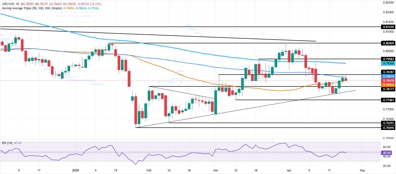 下方支撐位於4月13日低點72.61美元,若該水平被有效跌破,白銀價格將進一步下探4月7日低點68.28美元。上方初步阻力位於79.30美元附近的上升趨勢線,只有持續突破該水平,才可能進一步上漲至上述形態的水平阻力位83.35美元附近。