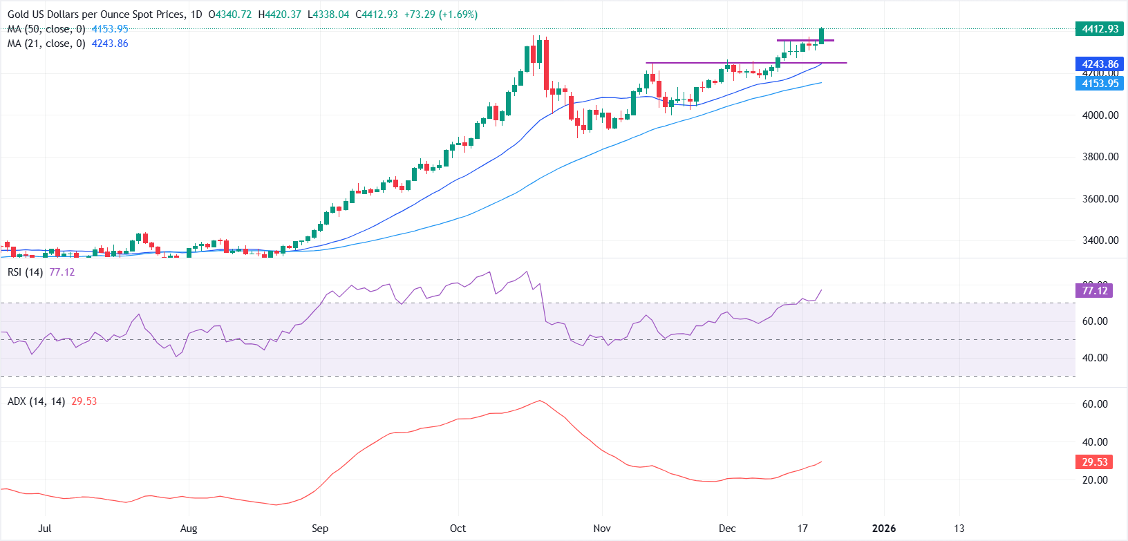 在日線圖上,黃金繼續舒適地交易於其21日簡單移動平均線(SMA)附近$4,244和50日SMA附近$4,154之上,這兩者均向上傾斜並強化了看漲偏向。只要價格保持在這些動態支撐之上,回調可能會吸引買家。
