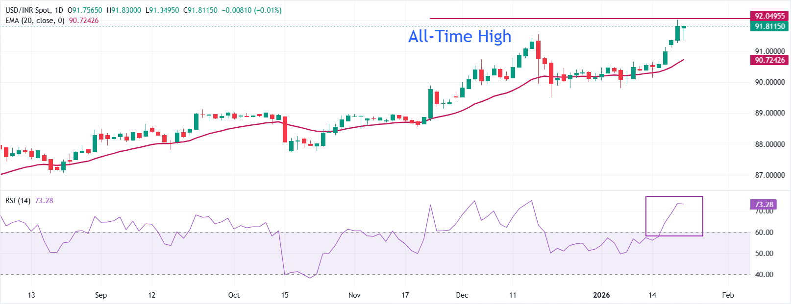 截至發稿時,美元/印度盧比在91.81附近穩固交易。該貨幣對保持在上升的20日指數移動平均線(EMA)之上,保持堅挺的看漲偏向。20日EMA繼續向上傾斜,確認趨勢強度。