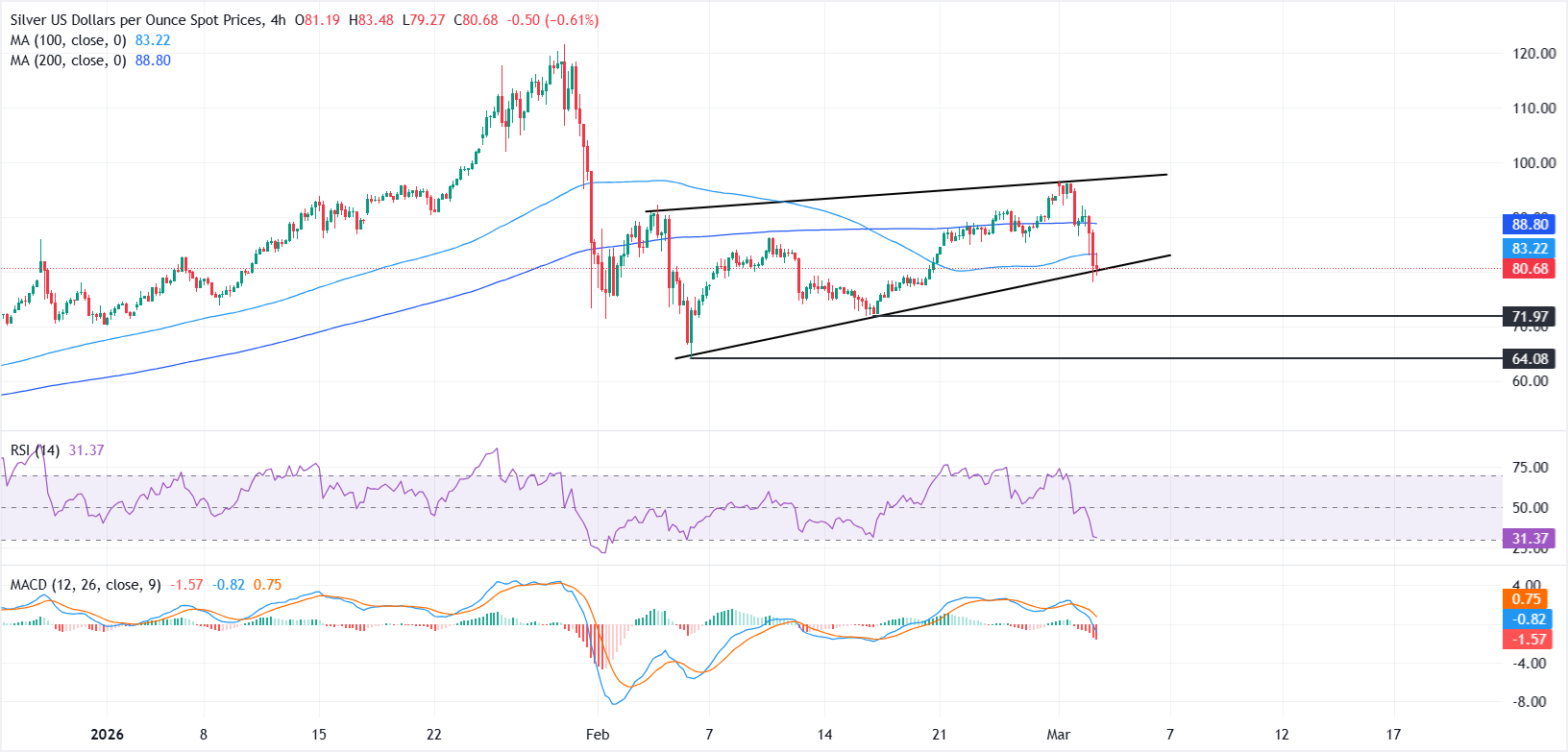 截至撰寫時,XAG/USD交易價格約為80.68美元,徘徊在一周多來的最低水平附近。