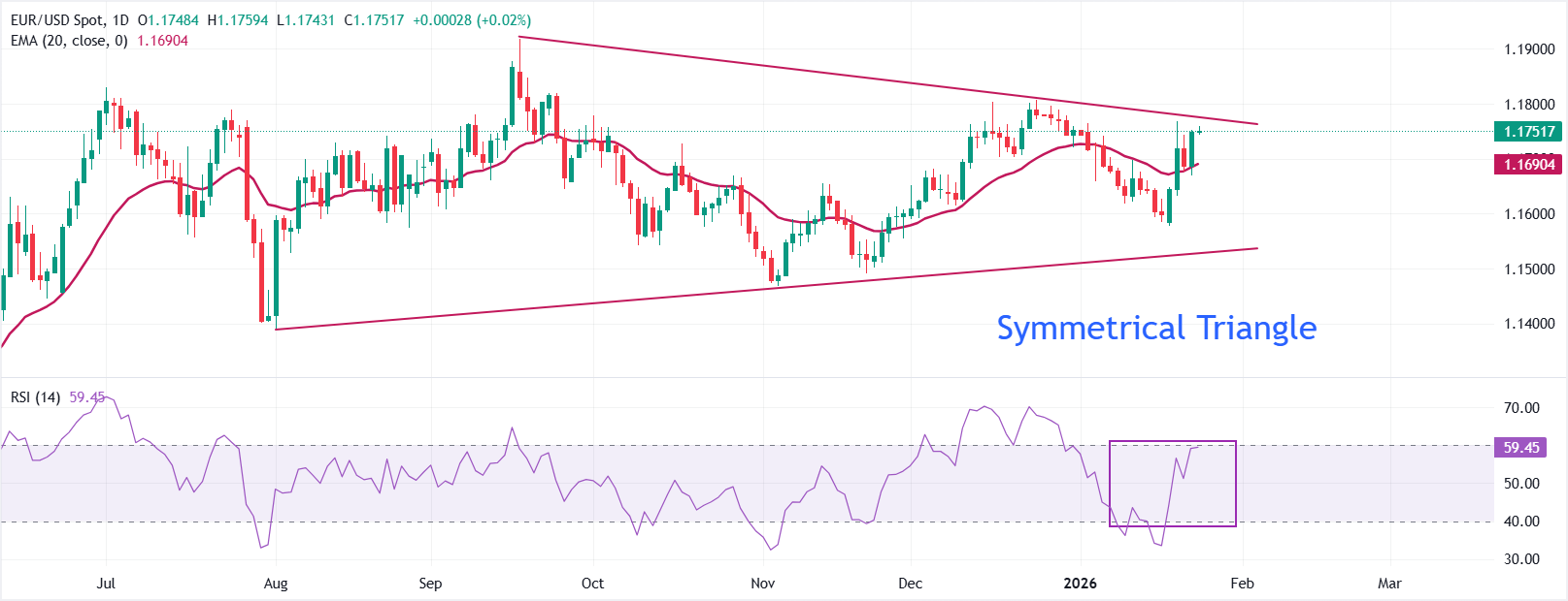 20日指數移動平均線(EMA)在1.1690上行,價格保持在其上方,保持短期反彈。收盤高於20日EMA將保持看漲偏向。14日相對強弱指數(RSI)為59.44,顯示出強勁的動能。