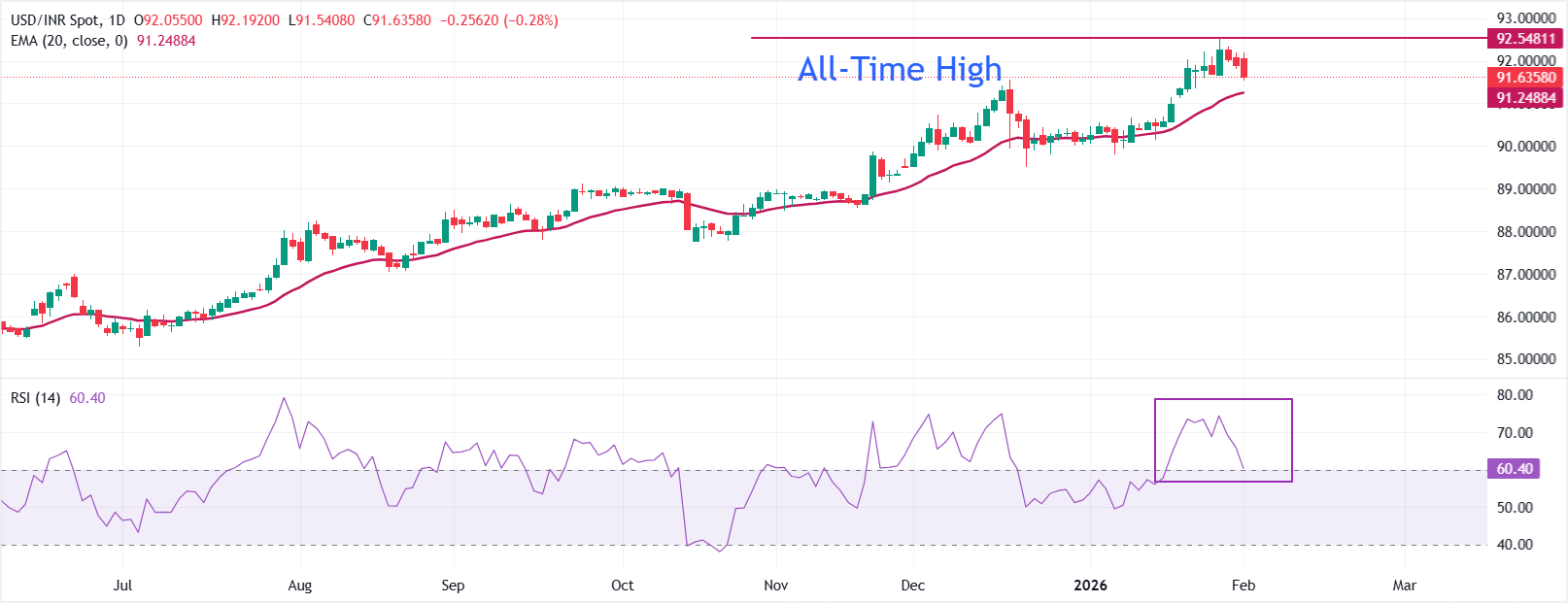 美元/印度盧比在撰寫時交易於91.60附近。該貨幣對穩固地保持在91.24的上升20日EMA之上,保持短期上升趨勢不變。均線持續上升,指向持續的買入壓力,傾向於逢低買入。