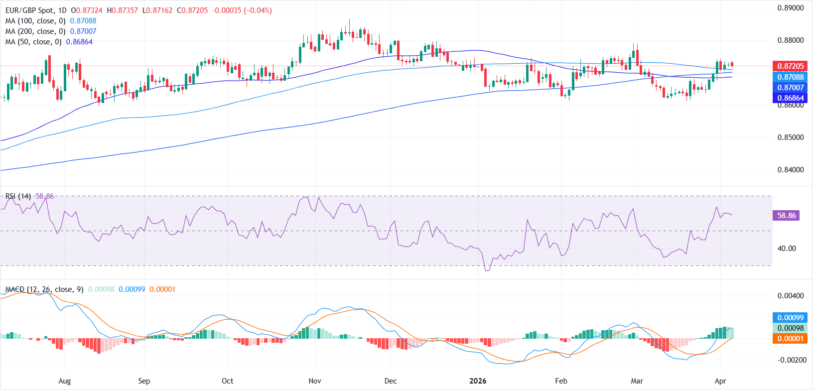 - 技術面上,歐元/英鎊維持溫和看漲偏向,價格保持在關鍵移動均線之上,RSI 和 MACD 均處於正區間。