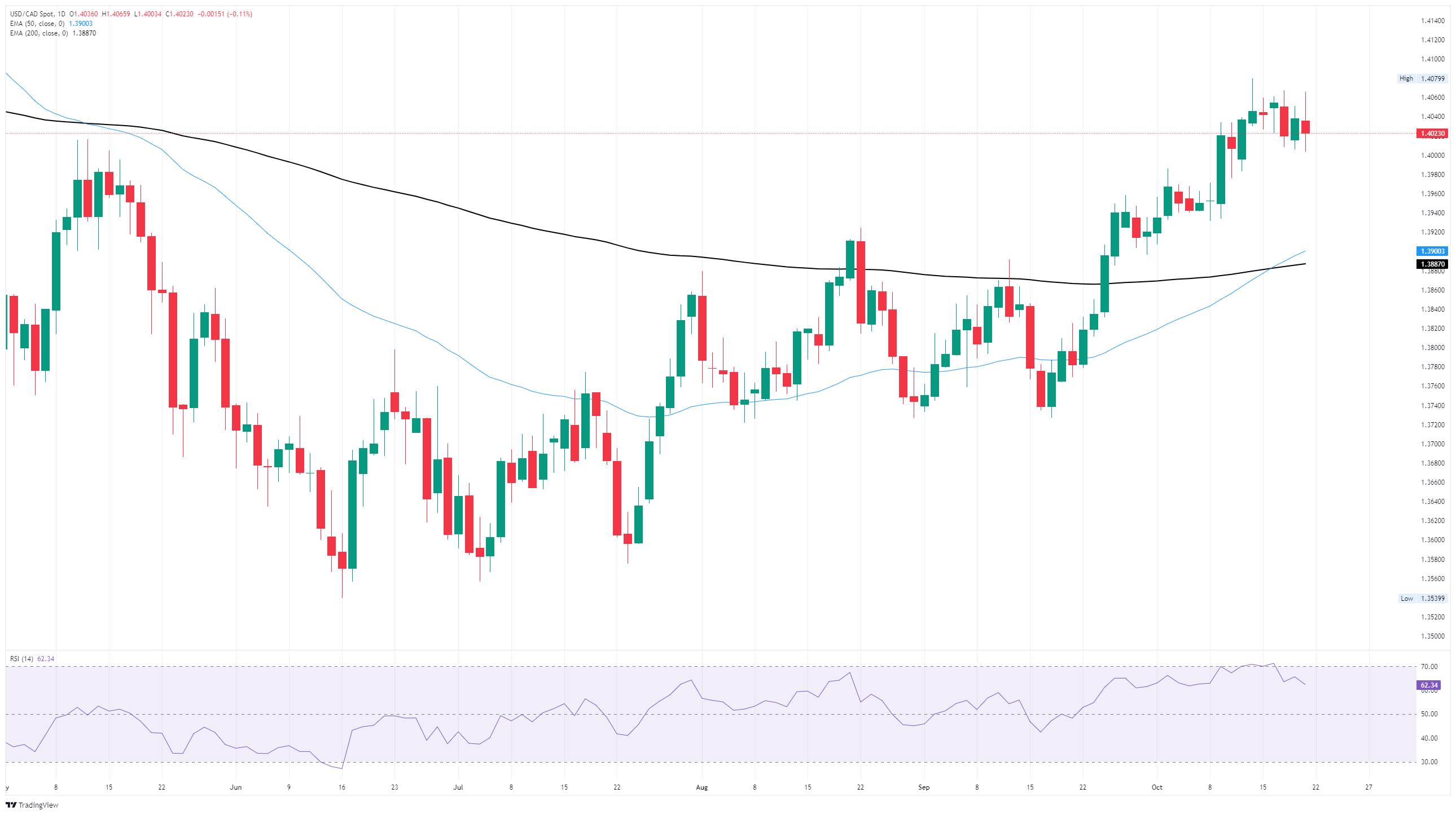 美元/加元日線圖顯示,美元對加元的交易接近1.4025,在測試1.4080附近的阻力後略有回落。自9月初以來,該貨幣對一直呈上升趨勢,形成了明顯的高點和低點上升模式。50日指數移動平均線(EMA)目前接近1.3900,已上穿200日EMA(1.3885),形成了交易者常稱的"金叉"。這一交叉通常預示著中期動能改善和買入興趣增加。