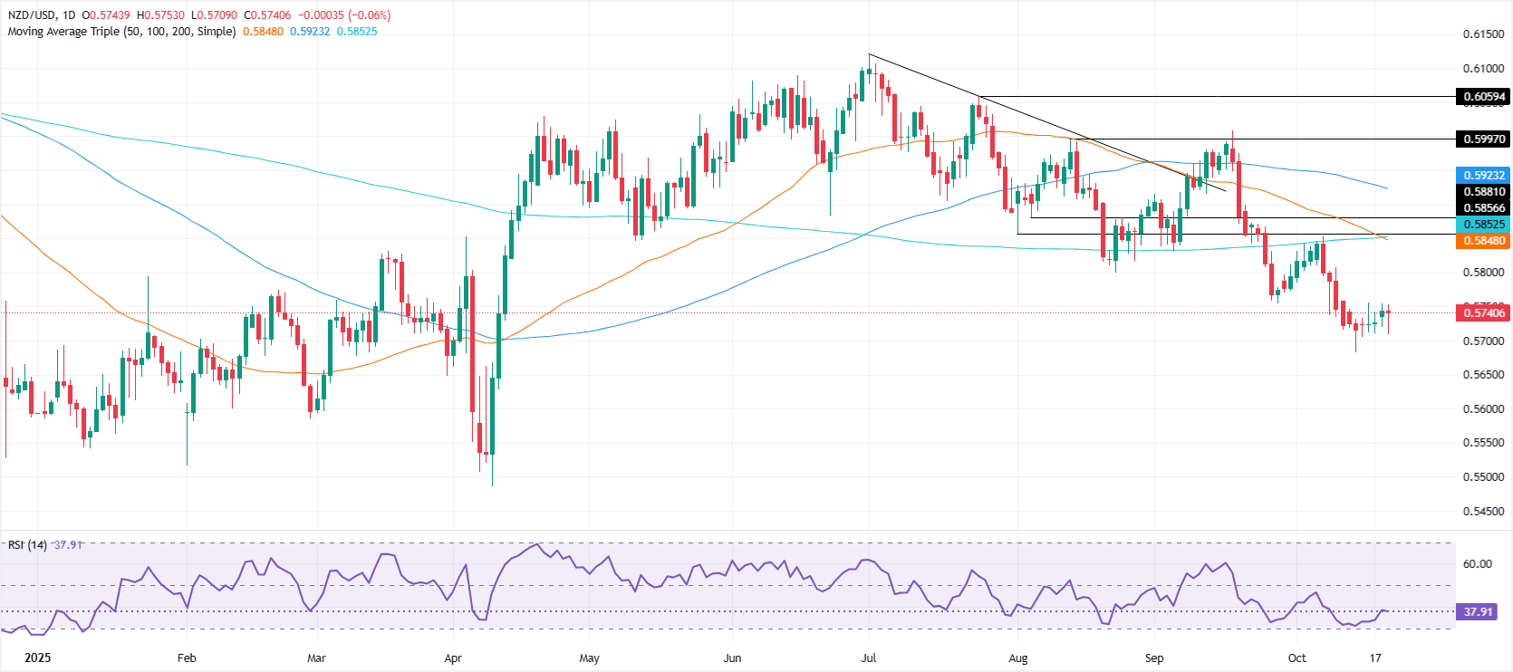 - 紐元在0.5700–0.5760區間內受限,相對強弱指數(RSI)顯示多頭和空頭之間的猶豫。
