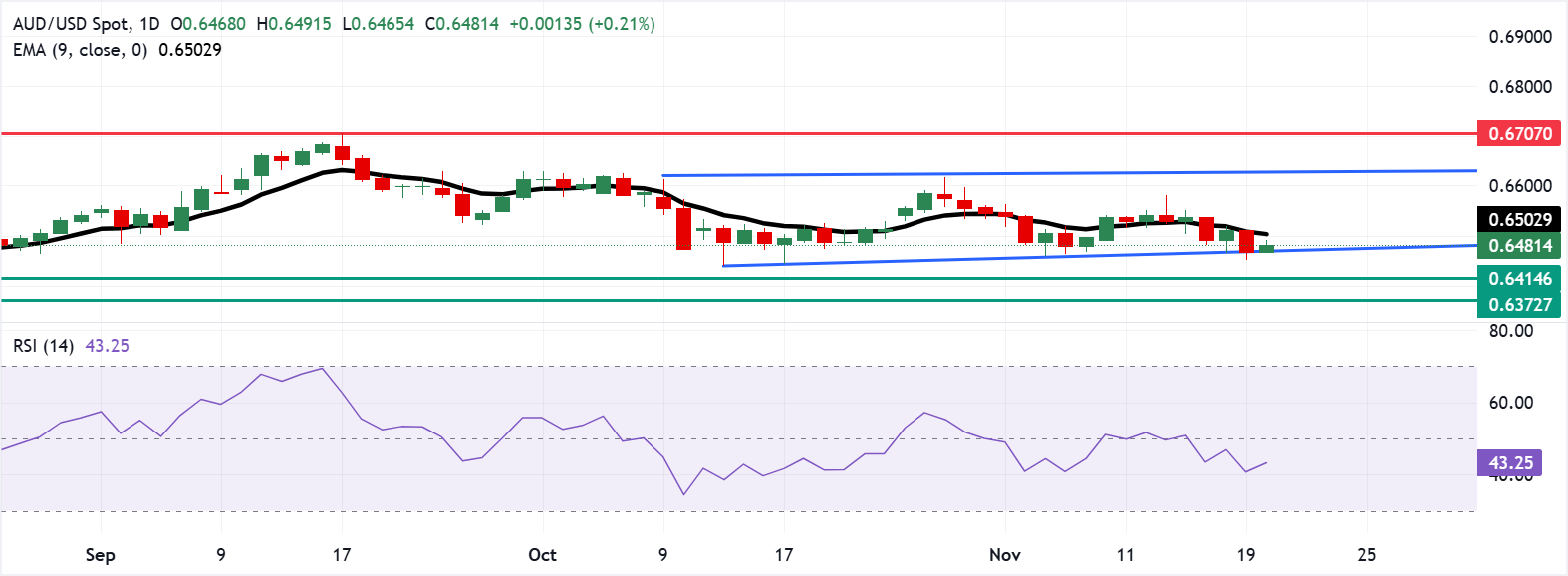 澳元/美元在週四交易於0.6480附近。日線圖分析表明,該貨幣對在矩形區間內橫盤整理,顯示出價格整合的時期。同時,價格仍低於九日指數移動平均線(EMA),突顯出短期價格動能較弱。