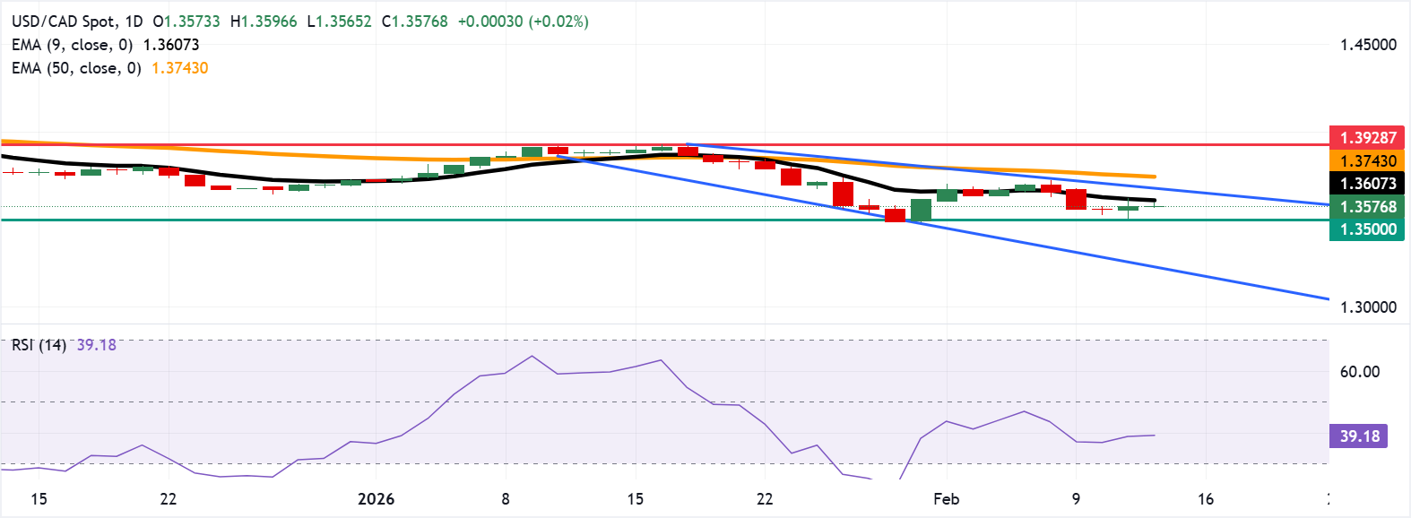 動能仍然脆弱,RSI仍低於50中線,因此反彈需要在1.3607的九日EMA上方收盤以獲得確認,從而緩解賣壓。若持續突破1.3690附近的上升通道邊界,隨後是50日EMA1.3743,將發出更強的反彈信號,並將目標指向1月16日創下的兩個月高點1.3928。