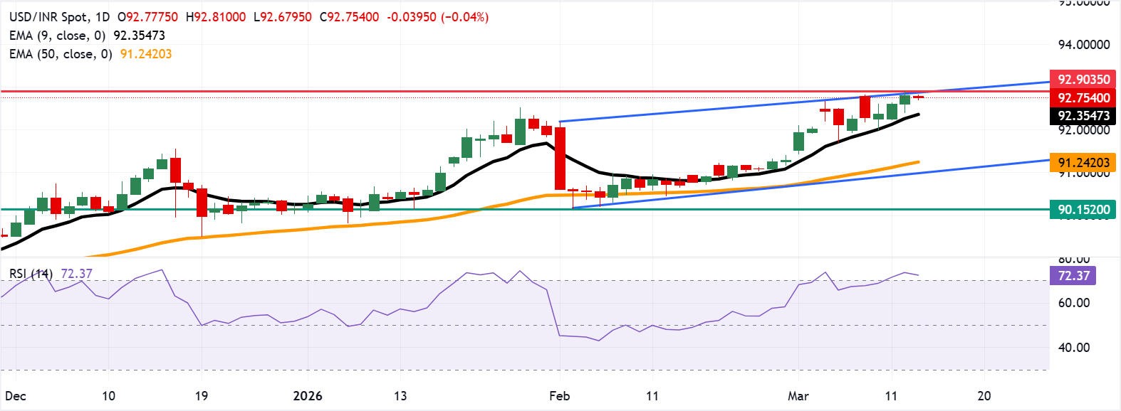 技術分析:美元/印度盧比測試通道上邊界,歷史高點接近93.00