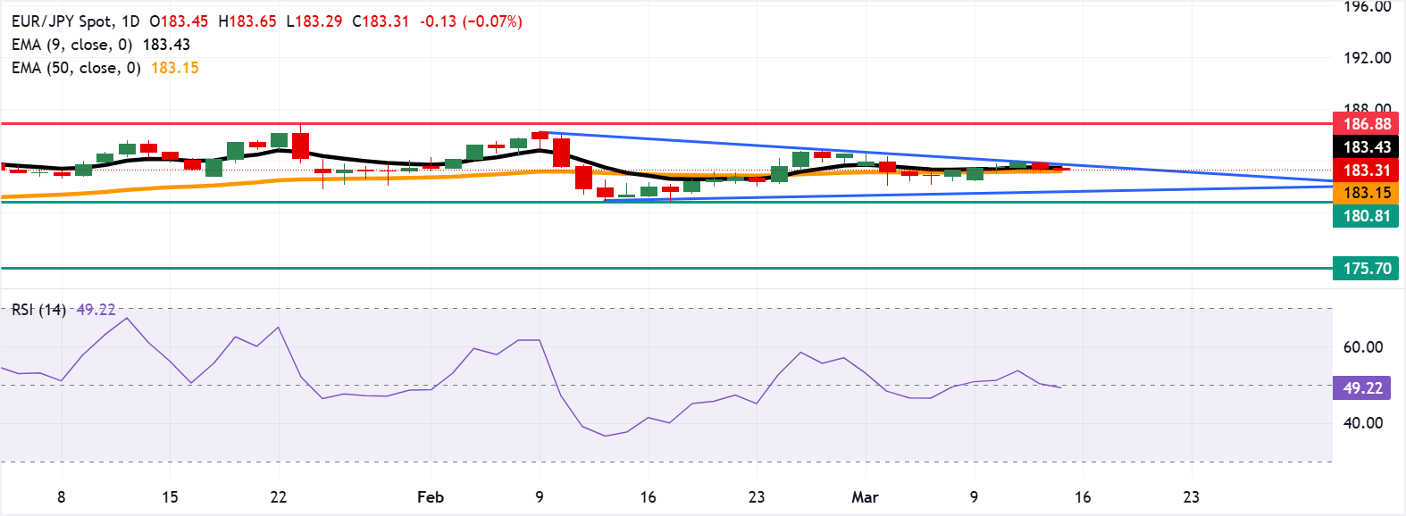 歐元/日元在週五亞洲時段連續第二個交易日擴大漲幅,交易價格在183.30附近。日線圖的技術分析顯示,現貨正在測試下降三角形的上邊界,暗示潛在的阻力和可能的下行延續。