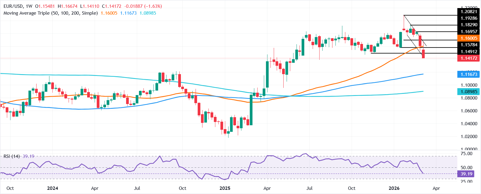 - 歐元/美元本週下跌1.74%,交易接近1.1414,跌破200日簡單移動平均線(SMA)。