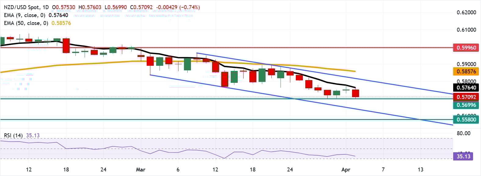 紐元/美元在連續兩天上漲後貶值近0.8%,週四歐洲時段交易於0.5710附近。日線圖的技術分析顯示持續的看跌偏向,因為該貨幣對仍處於下降通道形態內。