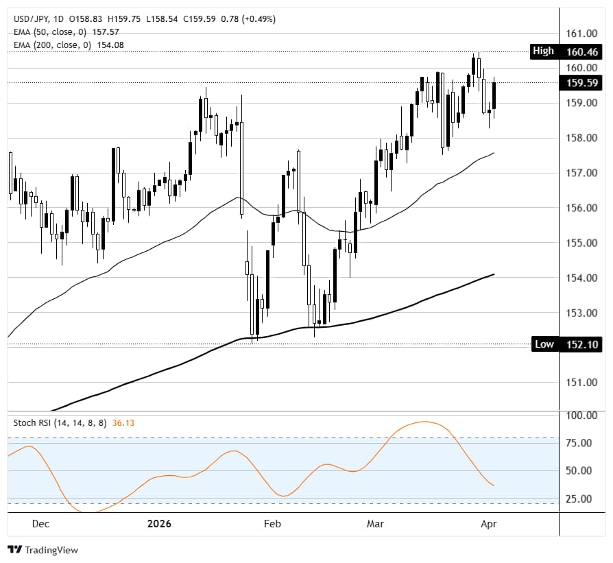4小時圖顯示歐元/英鎊在0.8724交易,短期偏向溫和看漲。相對強弱指數(RSI)保持在60以上,表明上漲動能持續,儘管移動平均收斂發散指標(MACD)線的看跌交叉暗示上漲壓力可能減弱。
