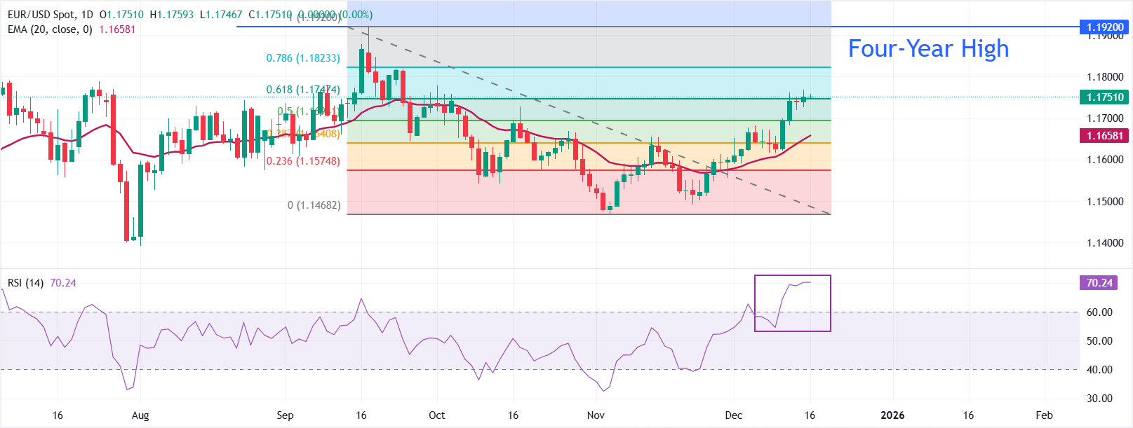 在撰寫時,EUR/USD在1.1750附近平穩交易,等待德國/歐元區PMI數據。20日指數移動均線(EMA)在1.1658上升並保持在現貨下方,保持短期上行偏向並提供初步支撐。若持續保持在20日EMA之上,將保持看漲動能。
